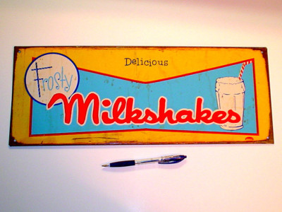 VINTAGE 1940's SODA FOUNTAIN FROSTY MILKSHAKES TIN SIGN