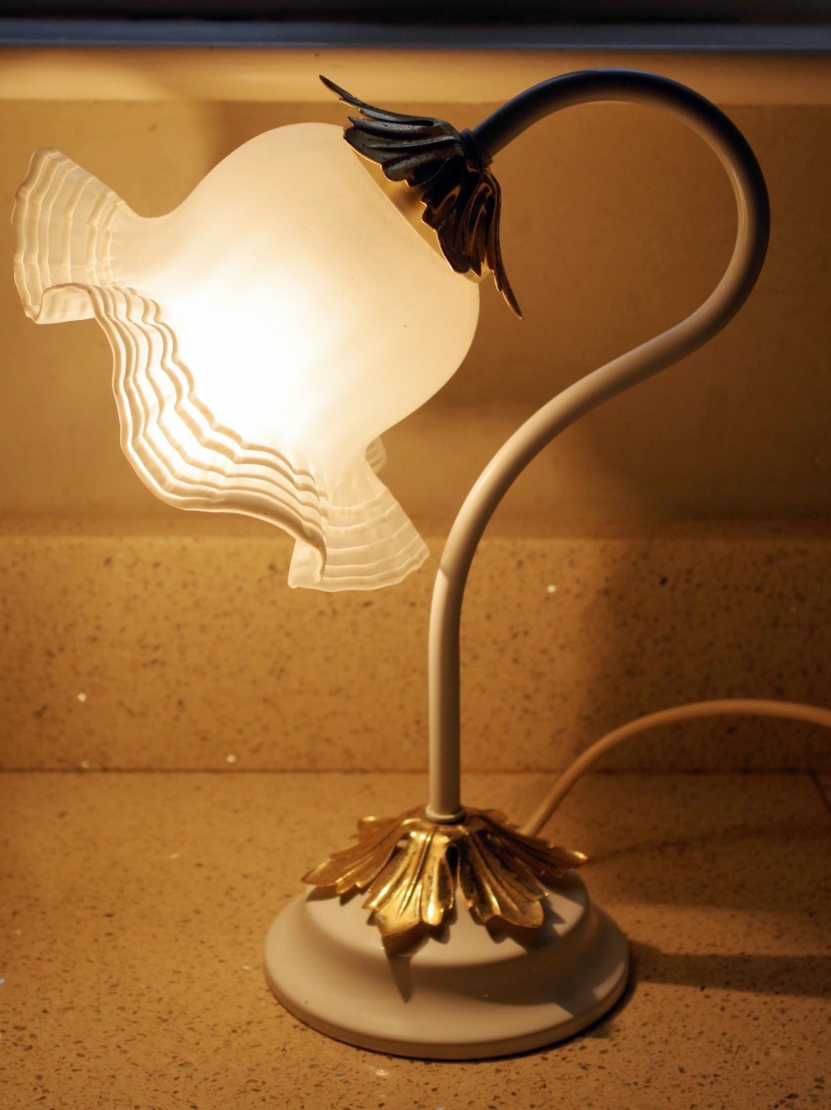 Title (ebay affiliate link): VINTAGE WHITE FROSTED GLASS SHADE SWAN NECK BRASS DETAIL TABLE LAMP 12" RL