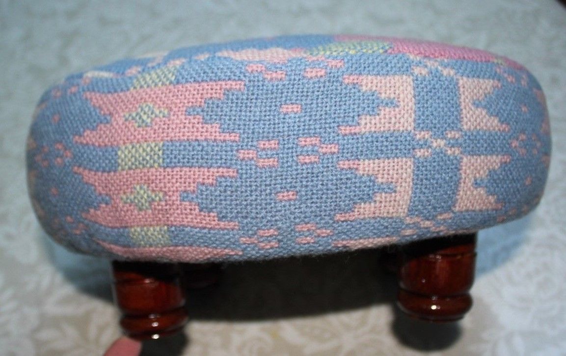 Title (ebay affiliate link): Welsh tapestry footstool . Small wooden turned feet. Pink/blue and cream