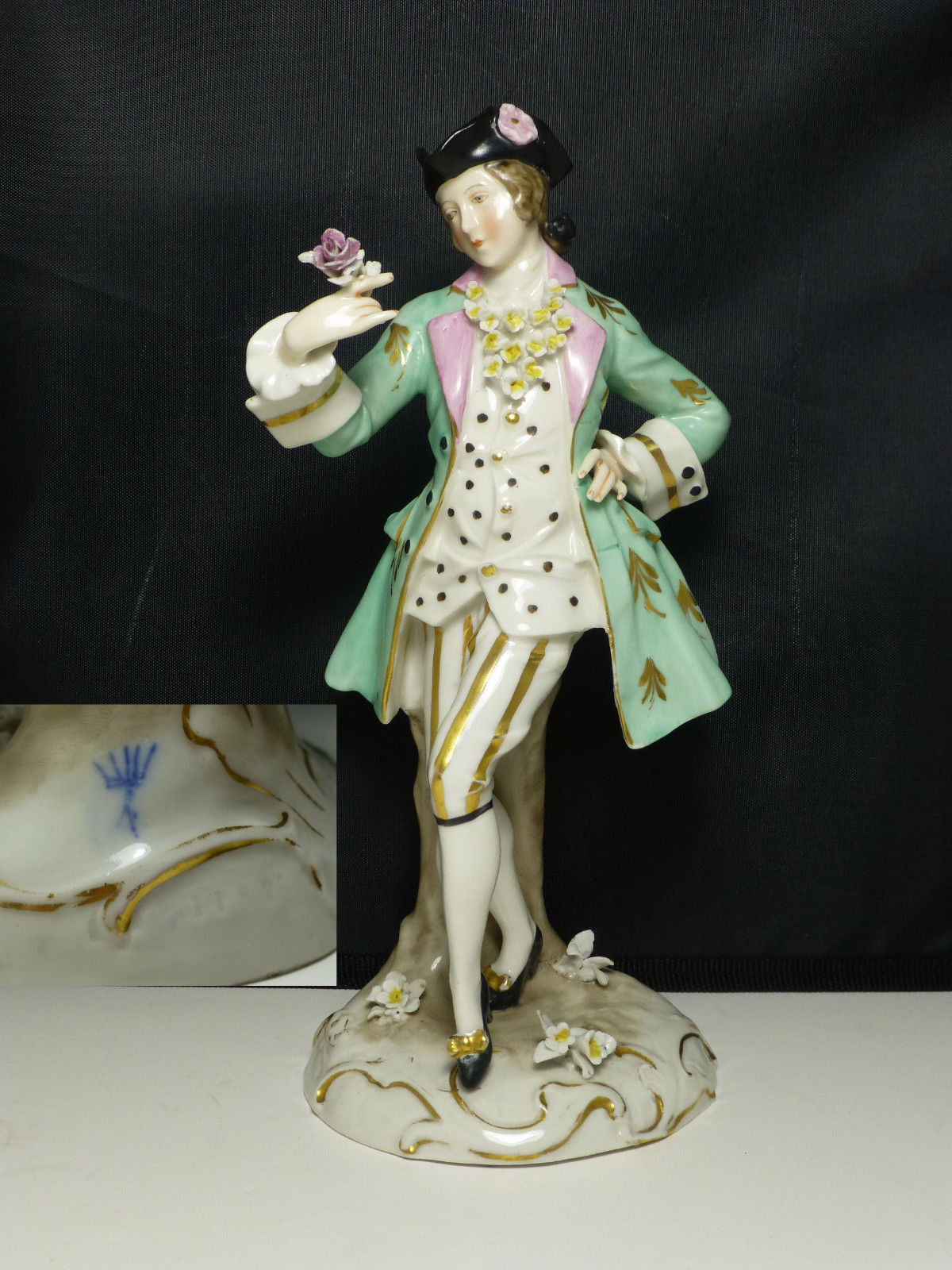 Title (ebay affiliate link): 8" Victorian Dressed Gentleman Porcelain w Flowers Meissen Dresden German Thieme