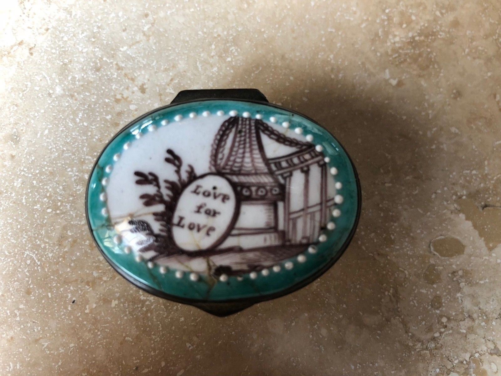 ANTIQUE BILSTON ENAMEL PATCH BOX "Love for Love"