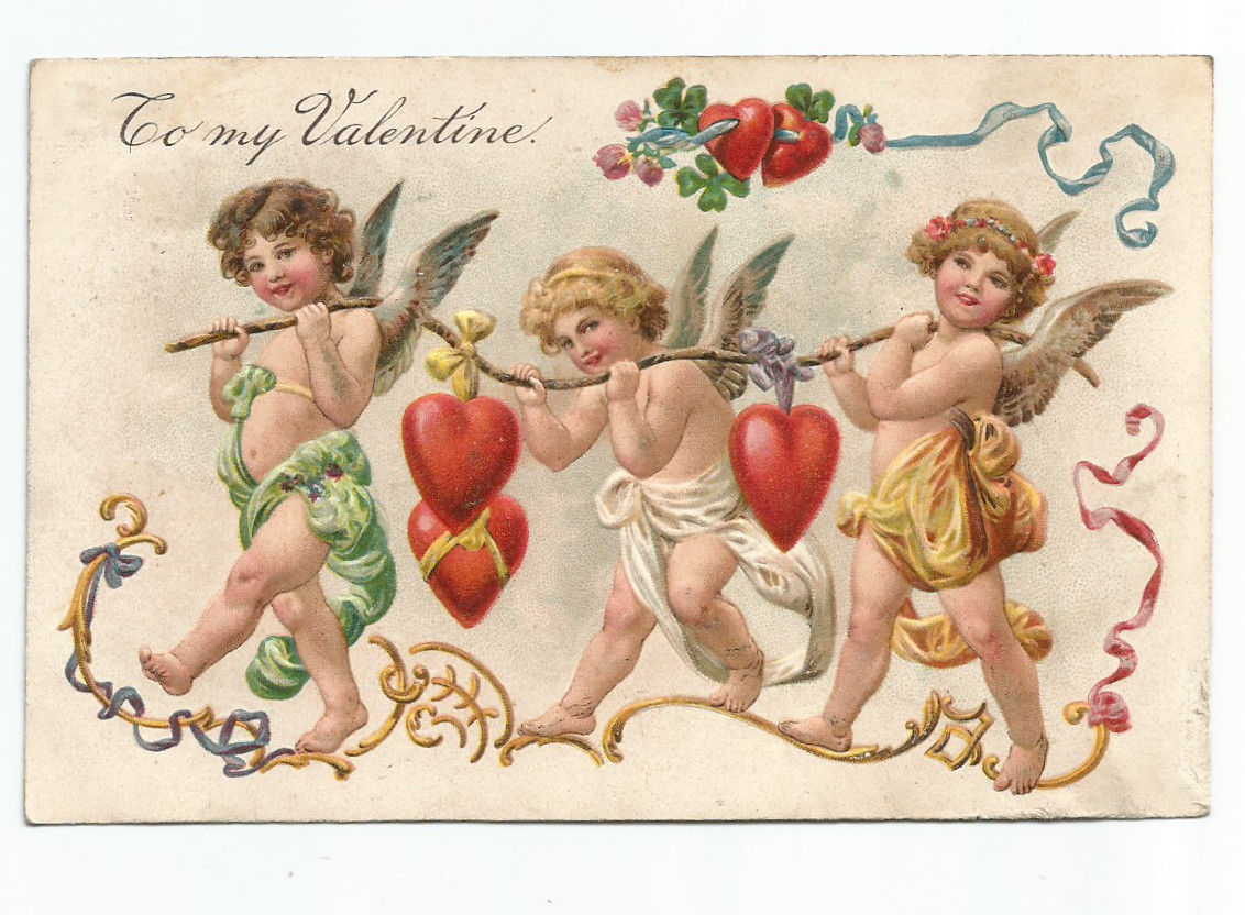 Cupids carrying a branch with hearts