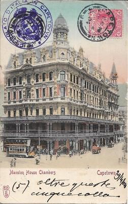 Postcard SOUTH AFRICA CAPETOWN MANSION HOUSE CHAMBERS WITH TRAM TO ITALY 1904