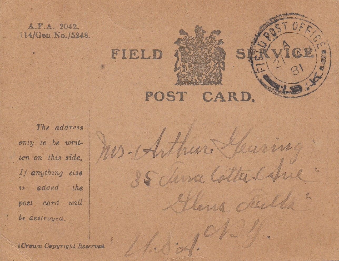 Great Britain WW1 "Field Service Post Card" to US. 1918 date reversed
