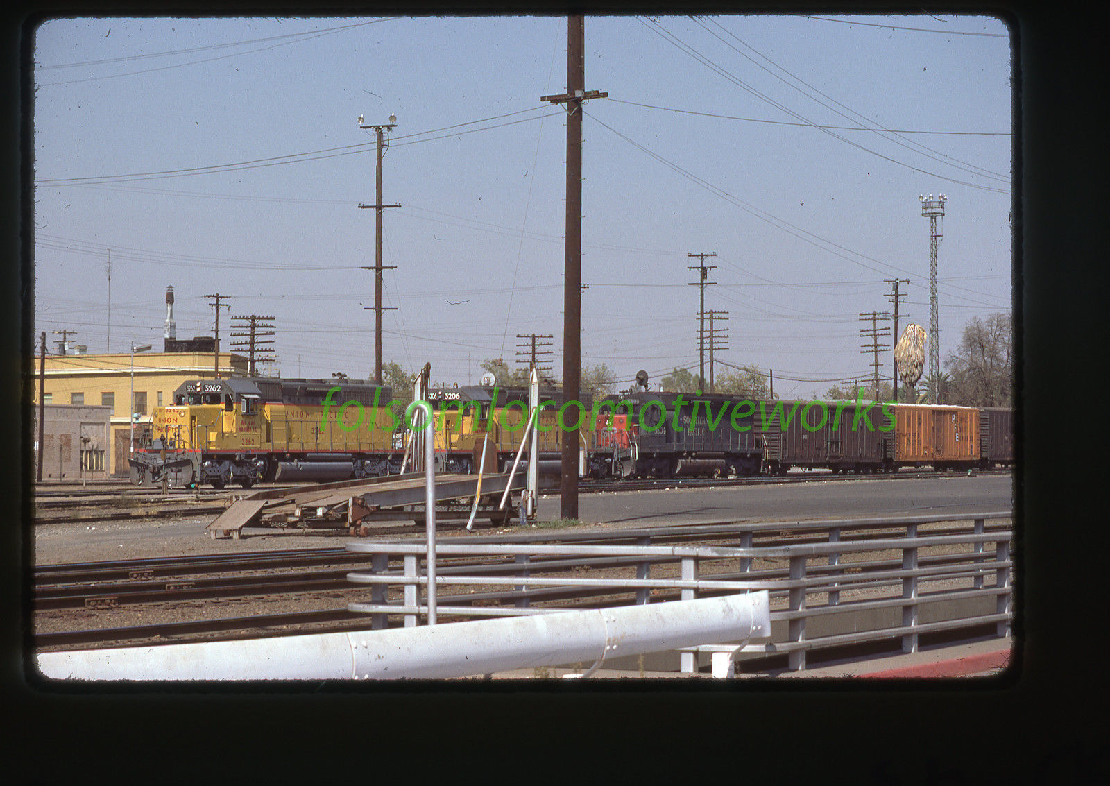 Union Pacific UP 3262 leads mixed consist in roseville, 9-28-74 kodachrome slide