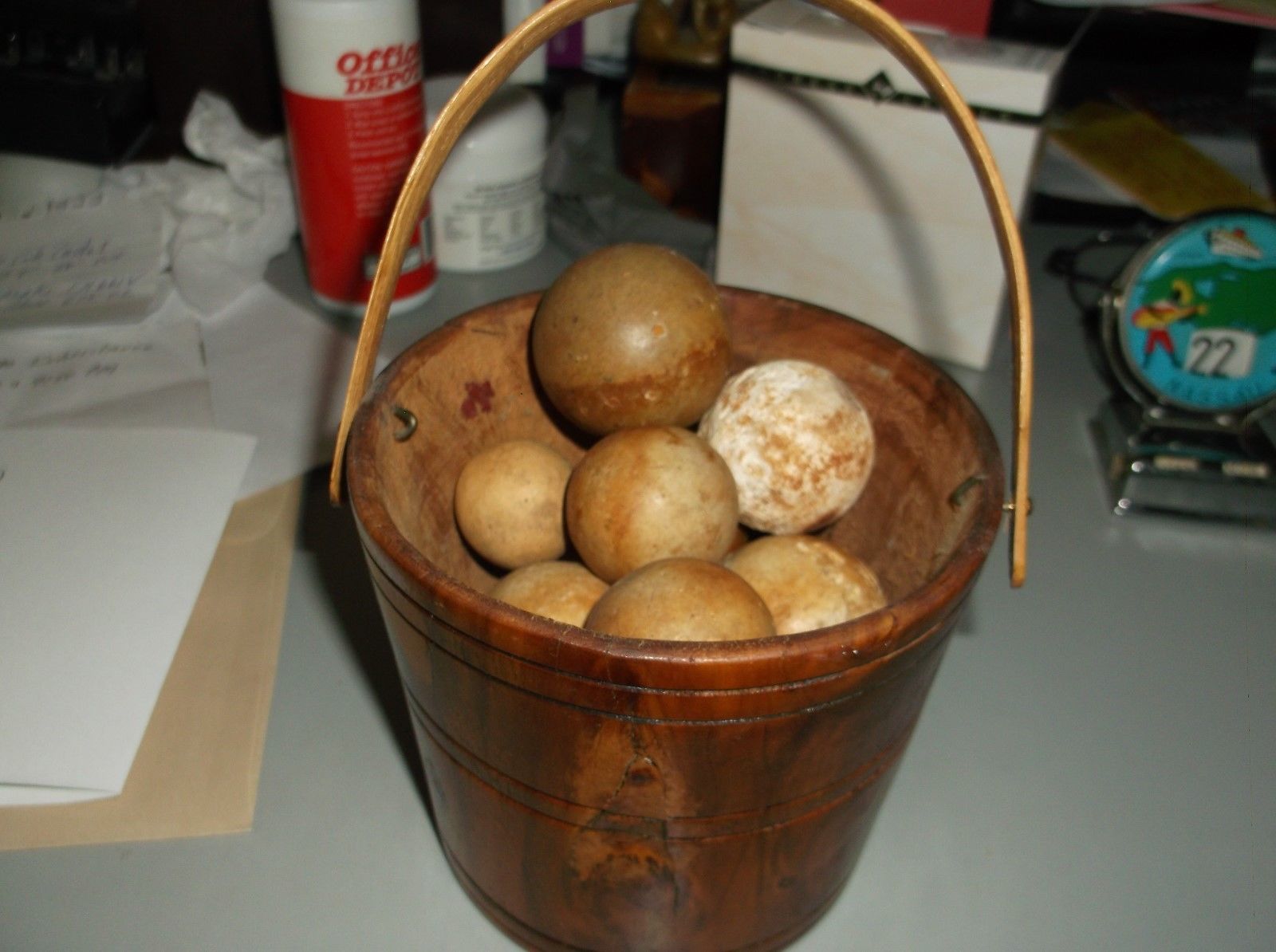 Title (ebay affiliate link): Small Antique Wooden Bucket with Stone Marbles