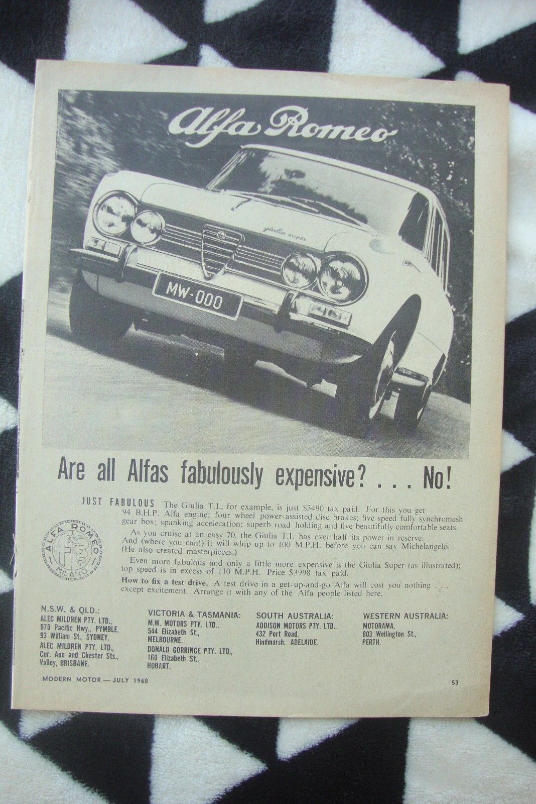Title (ebay affiliate link): 1968 Alfa Romeo Guilia TI Sedan Aussie Original Magazine Advertisement