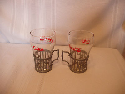 Title (ebay affiliate link): set of 2 Coca Cola glasses and metal holders 1985 L@@K