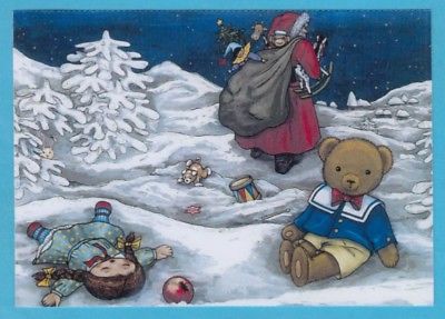 Santa Claus with toys, doll, teddy bear and a drum, russian reprinting