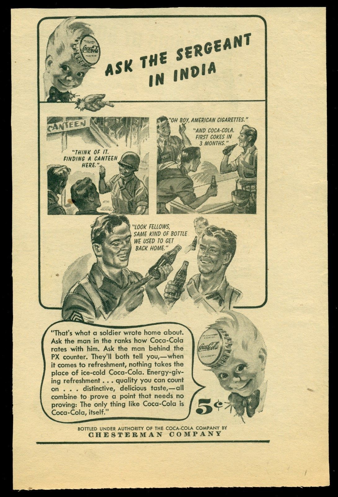 1943 WWII COCA-COLA ad Ask The Army Sergeant in India Chesterman Co Iowa