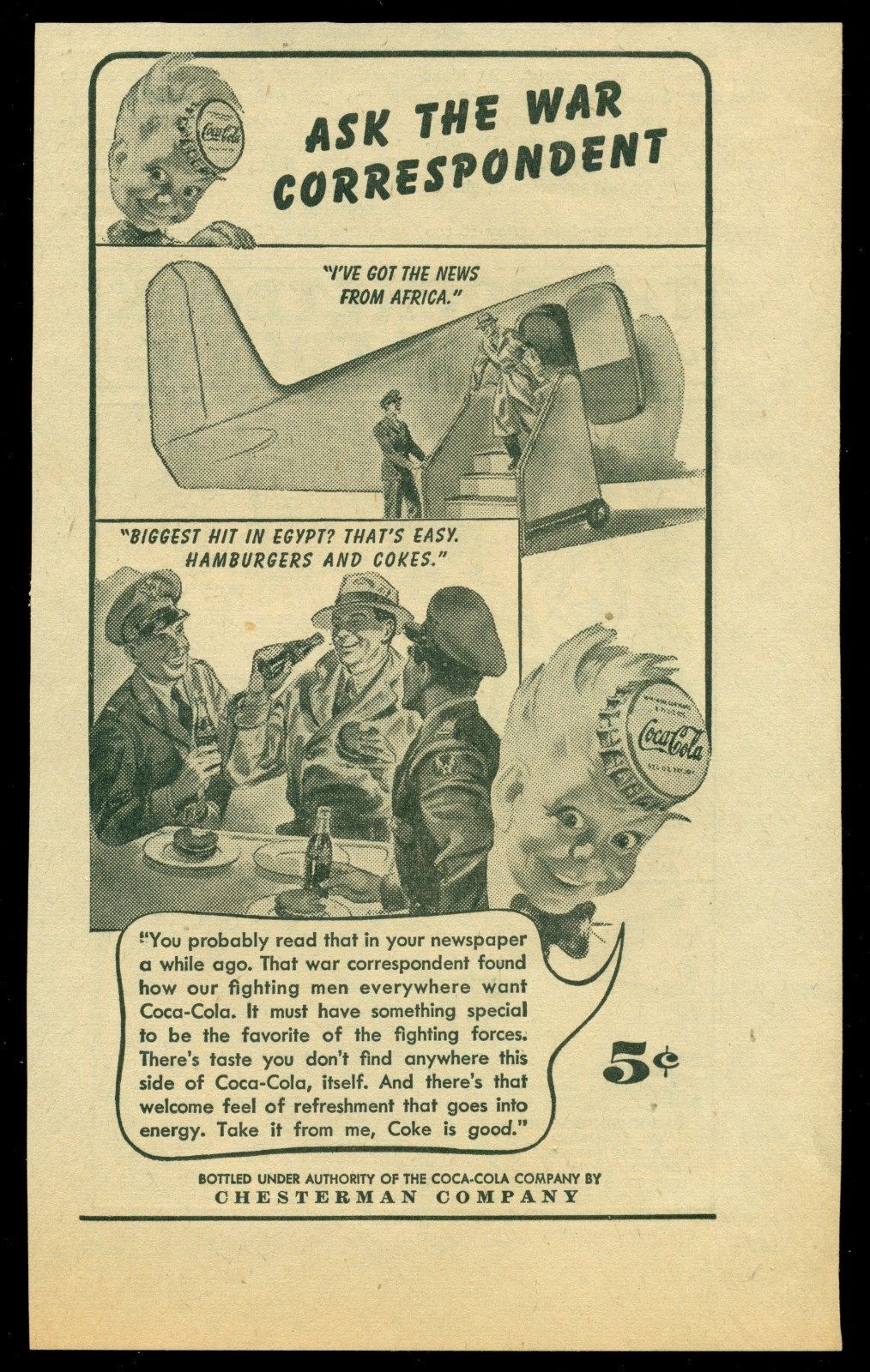 1943 WWII COCA-COLA ad Ask The War Correspondent Chesterman Iowa