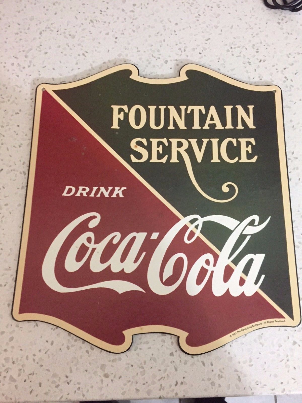 Title (ebay affiliate link): Coca Cola Nostalgic Print Fountain Service 1991 Cardboard Sign 11"x12"