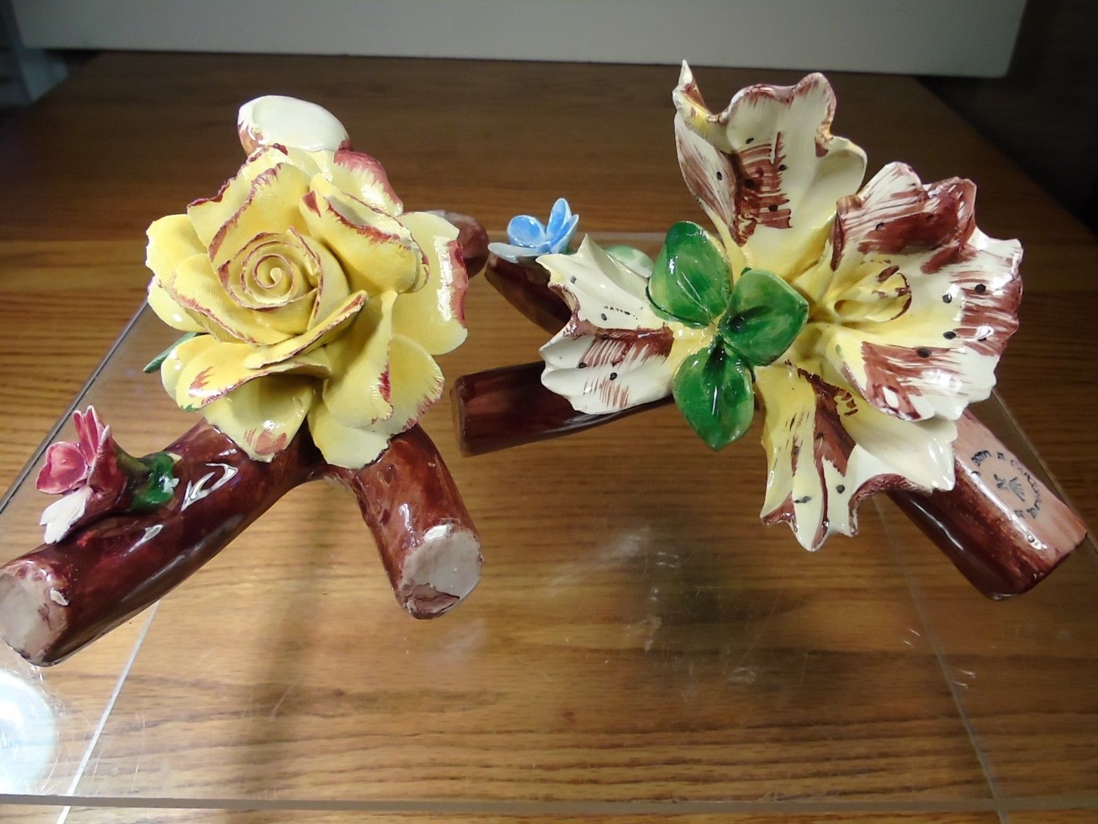 Title (ebay affiliate link): PAIR of CAPODIMONTE ITALY Stem on a log YELLOW/PURPLE FLOWERS