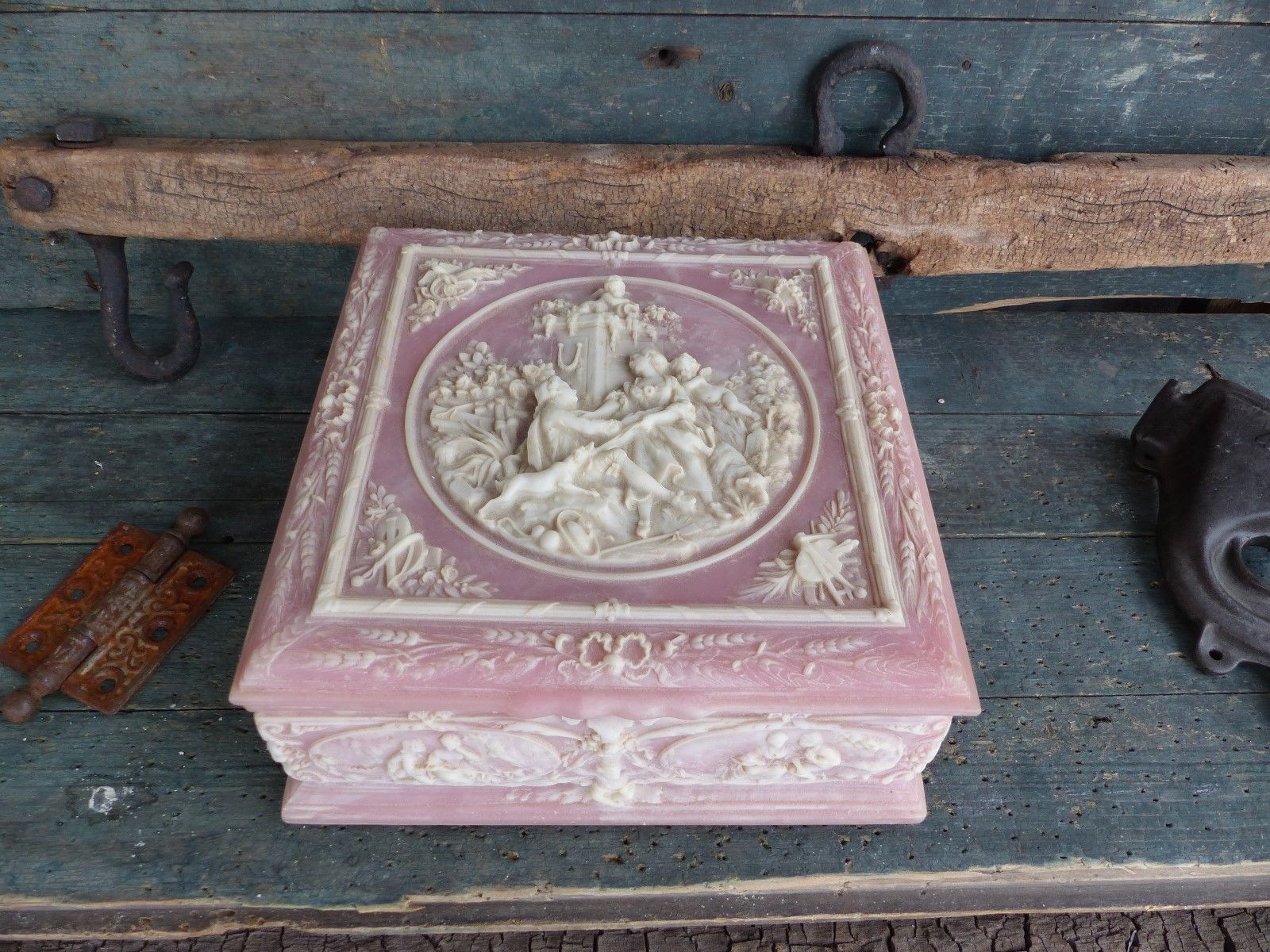 vintage dresser trinket jewelery box ornate incolay stone lovers with hounds