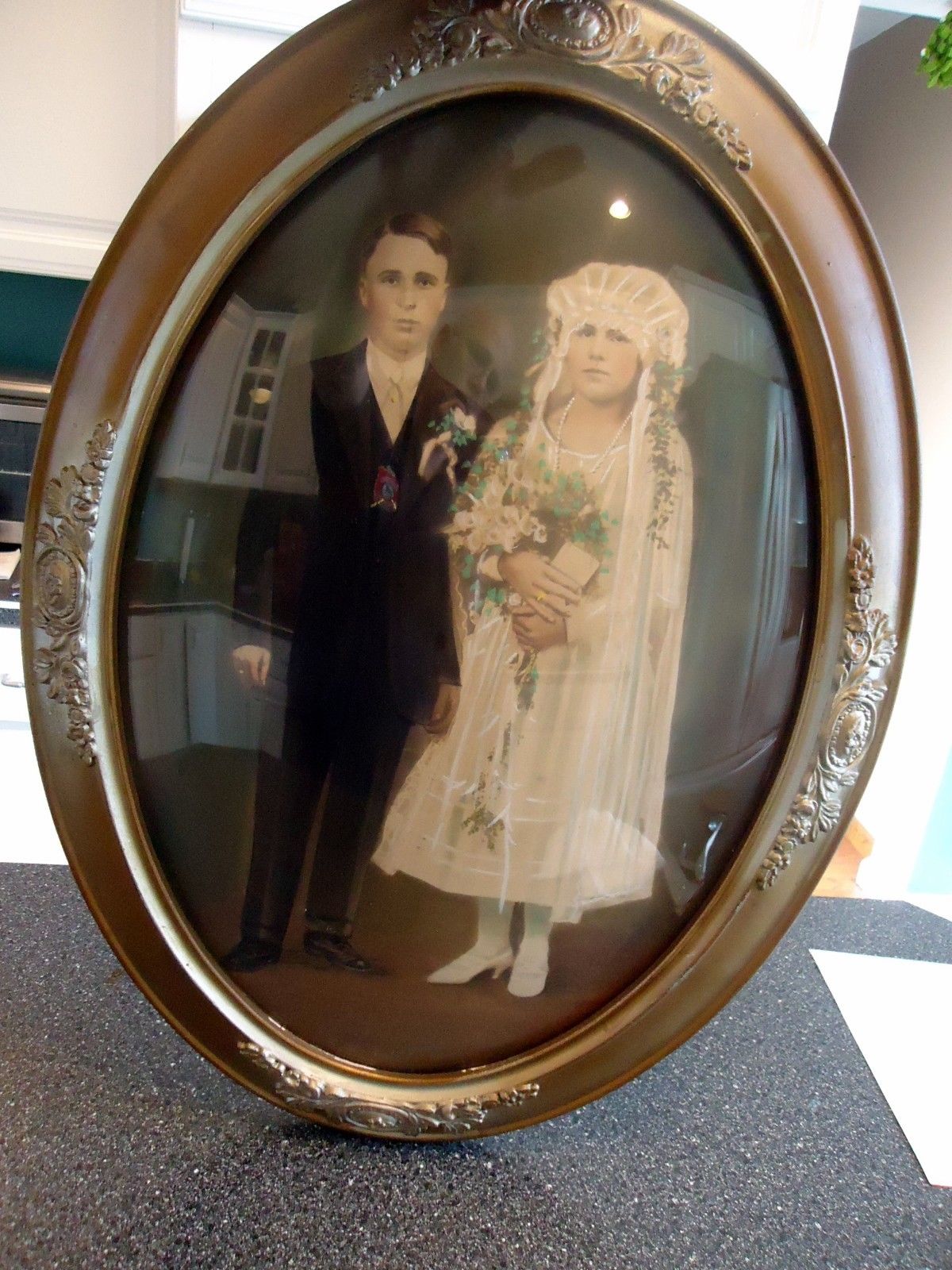 Vtg Oval Victorian Frame Convex Bubble Glass, bride & groom