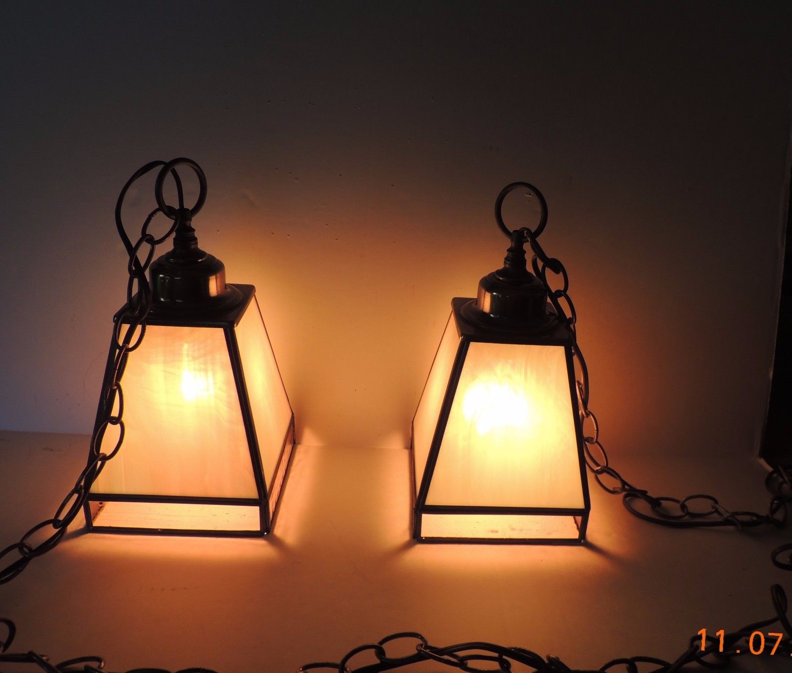 Title (ebay affiliate link): 2 Matching Arts and Craft Mission Slag Glass Lanterns Swag Lamps 12" Tall
