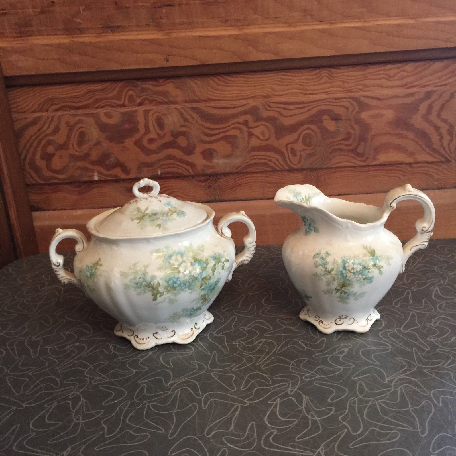 Title (ebay affiliate link): Antique John Maddock & Sons England Royal Vitreous Sugar & Creamer Blue Flowers