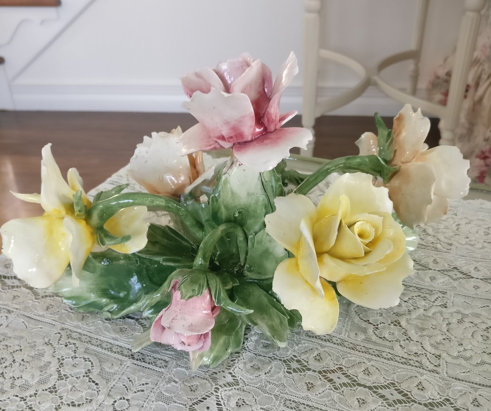 Title (ebay affiliate link): CAPODIMONTE LARGE PORCELAIN CABBAGE ROSES PINK YELLOW PEACH CENTERPIECE ITALY