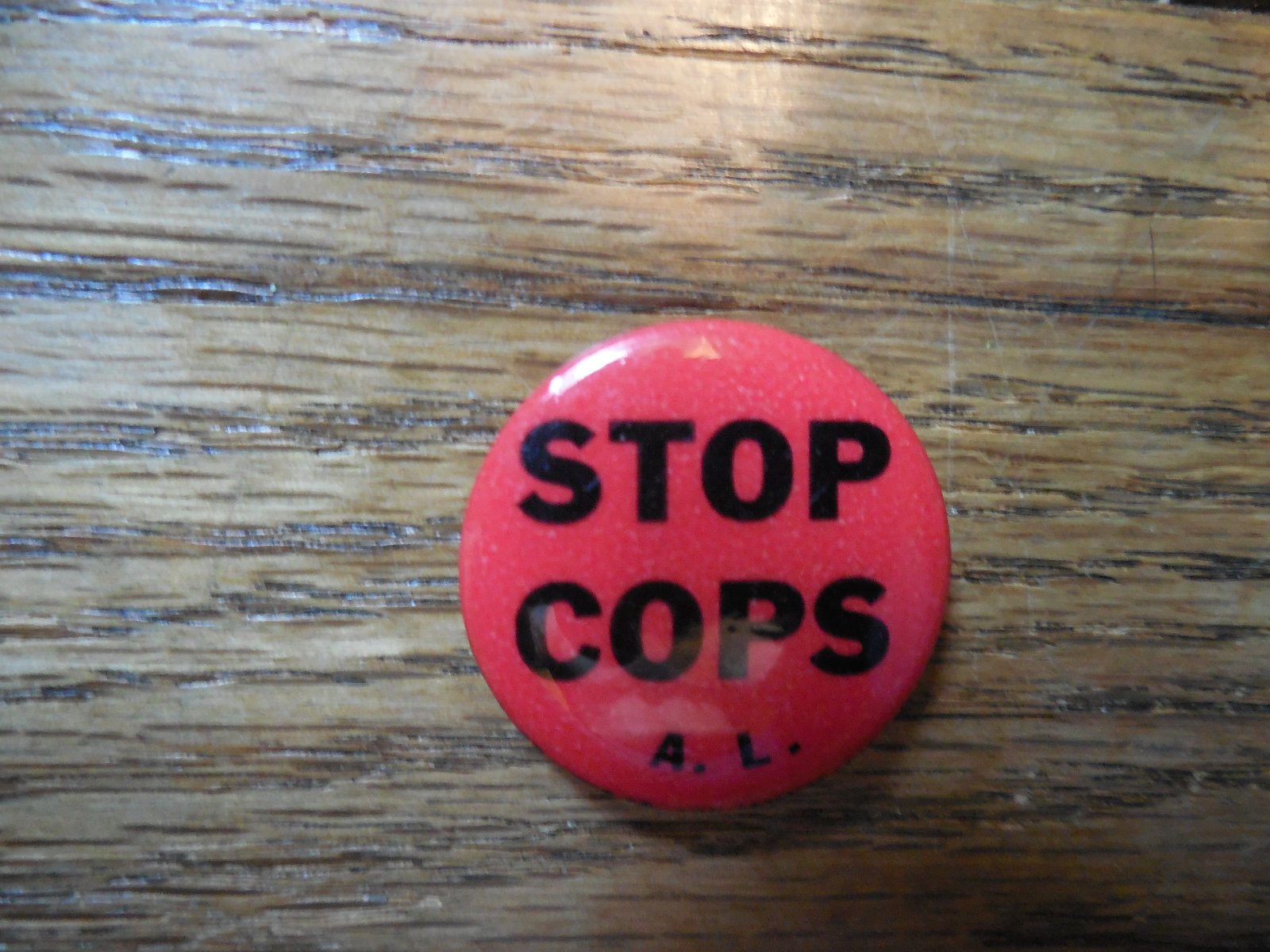 Pin Back Stop Cops A. L. Protest Cause Peace Button 1960''s Berkeley Police
