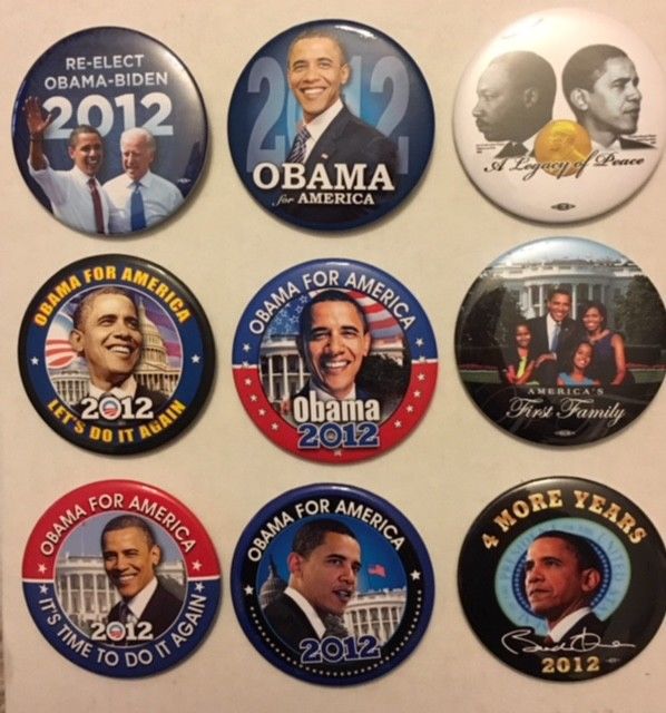 Title (ebay affiliate link): Nine 3" Barack Obama Presidential Political Campaign Pin Buttons