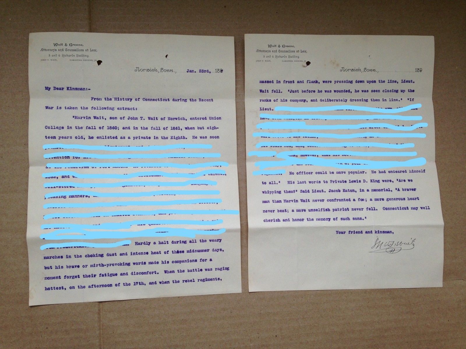 1897 SIGNED LETTER FROM JOHN TURNER WAIT,CONNECTICUT US GOP REPRESENTATIVE