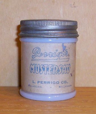 Perrigo Mustersav Milkglass Jar Paper Label Vintage