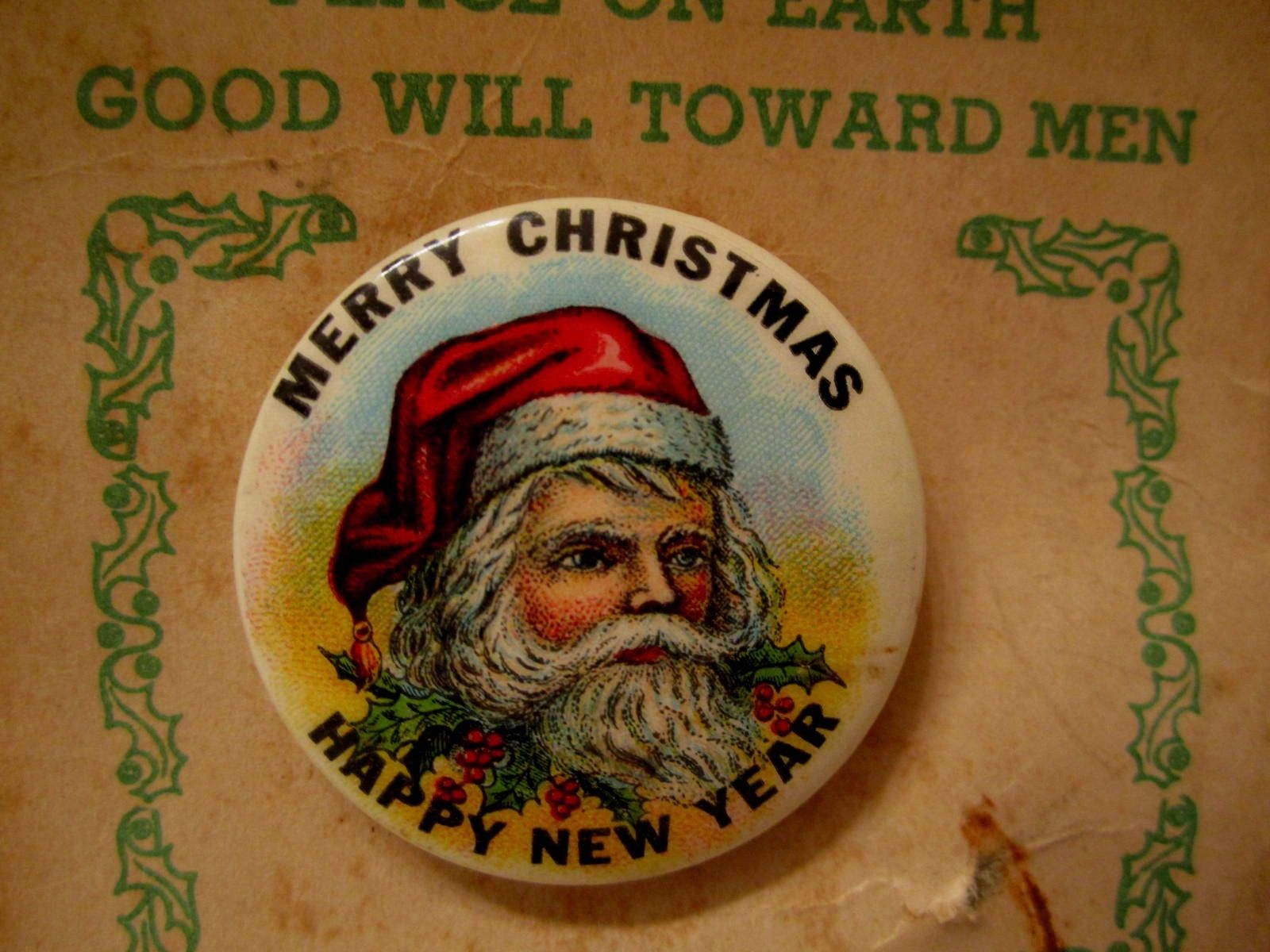 Title (ebay affiliate link): OLD SANTA MERRY CHRISTMAS HAPPY NEW YEAR CELLULOID PINBACK BUTTON ON CARD