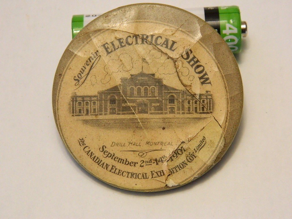 Title (ebay affiliate link): ADVERTISING POCKET MIRROR CELLULOID CANADIAN ELECTRICAL SHOW 1907 DRILL HALL