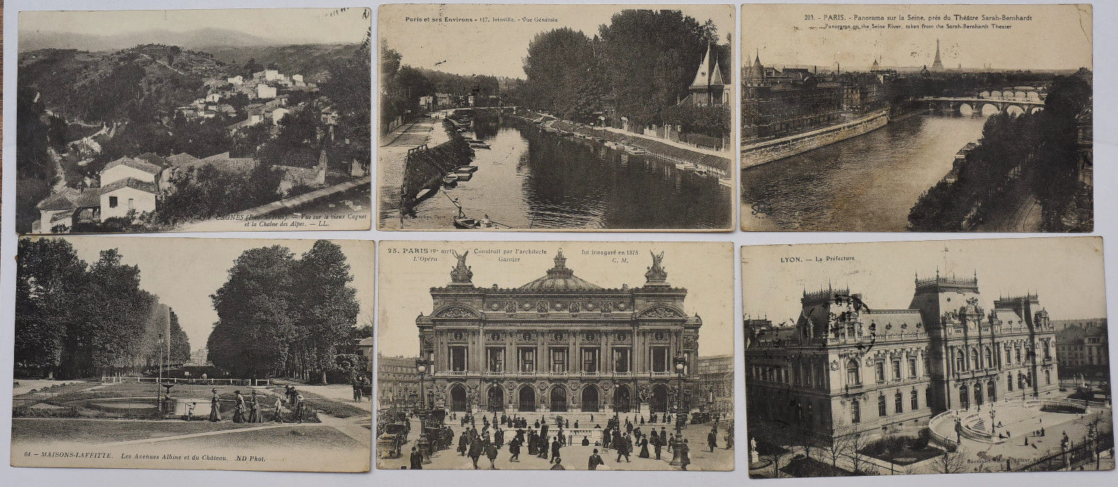 6 x Old French Postcards ~ France ~ Paris ~ Lyon ~ Cagnes