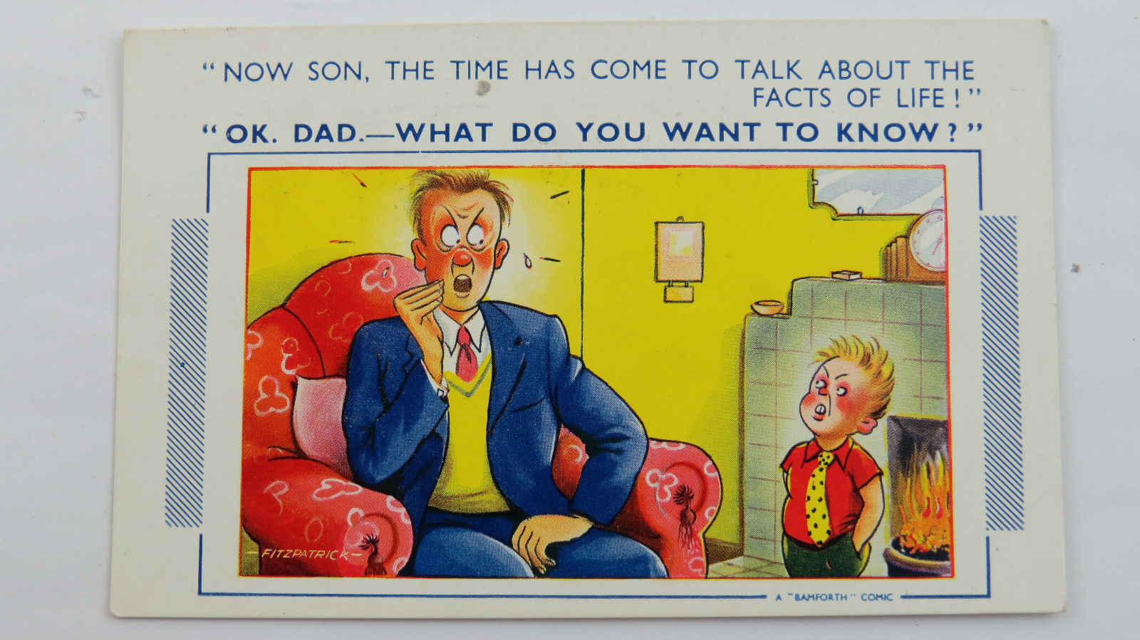 Title (ebay affiliate link): 1957 Vintage Risque Funny Postcard School Curriculum Boy Sex Education Parenting