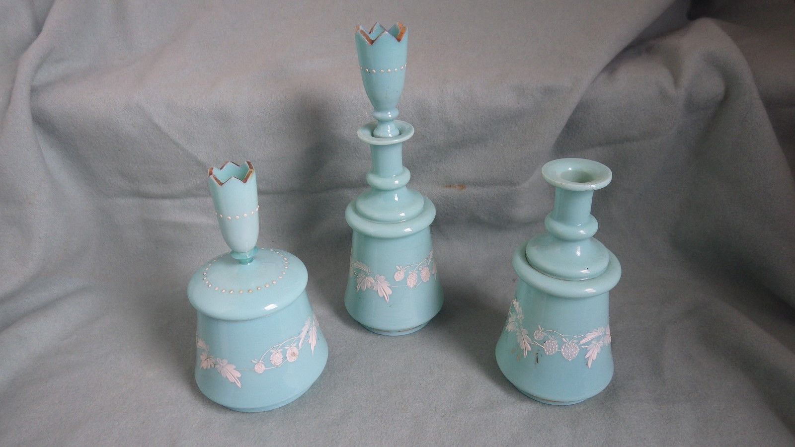 Title (ebay affiliate link): SET Opaline ANTIQUE BOHEMIAN PERSIAN TURKISH HARRACH PAINTED GLASS VASE DECANTER