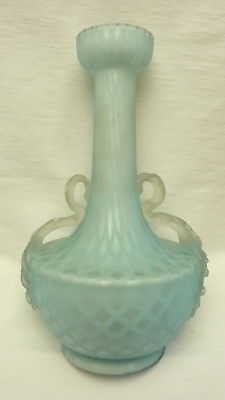 Antique Blue Satin Glass Vase Diamond Pattern Cased White Glass 11"