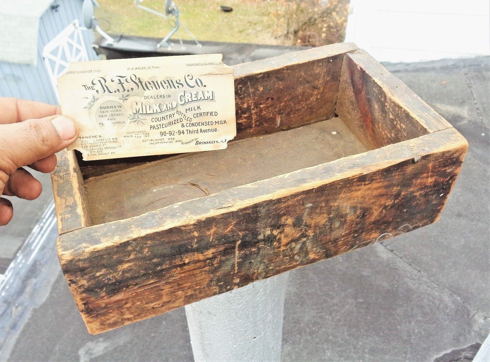 Title (ebay affiliate link): Antique Primitive Wooden Crate Old Wood Box THE R.F. STEVENS CO MILK & CREAM