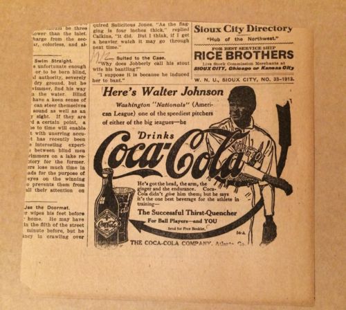 Coca-Cola Baseball Newspaper Ad Walter Johnson 1914 Sign Paper