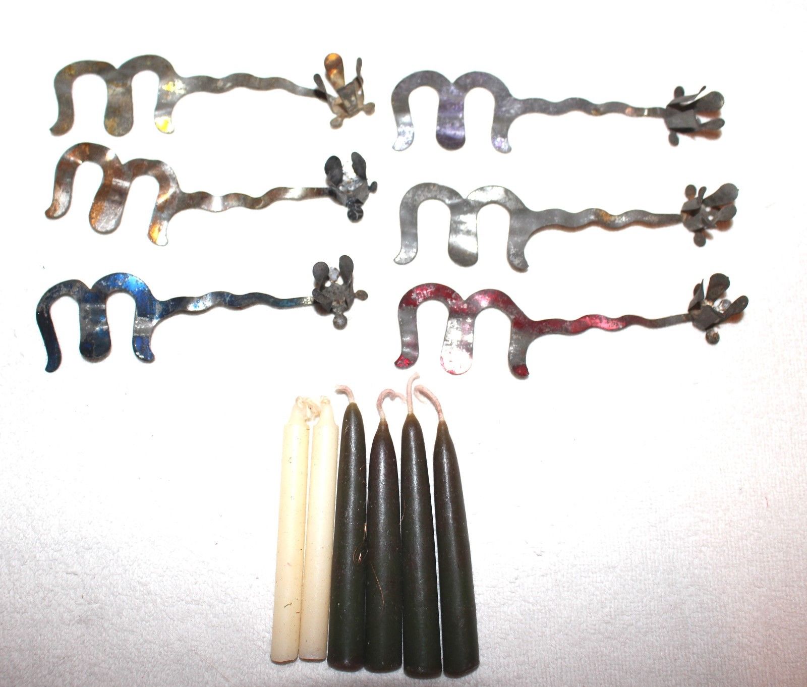 Title (ebay affiliate link): Six "E" Extended Tin Candle Holders. Lacquered. Germany. 1903. Judged more safe