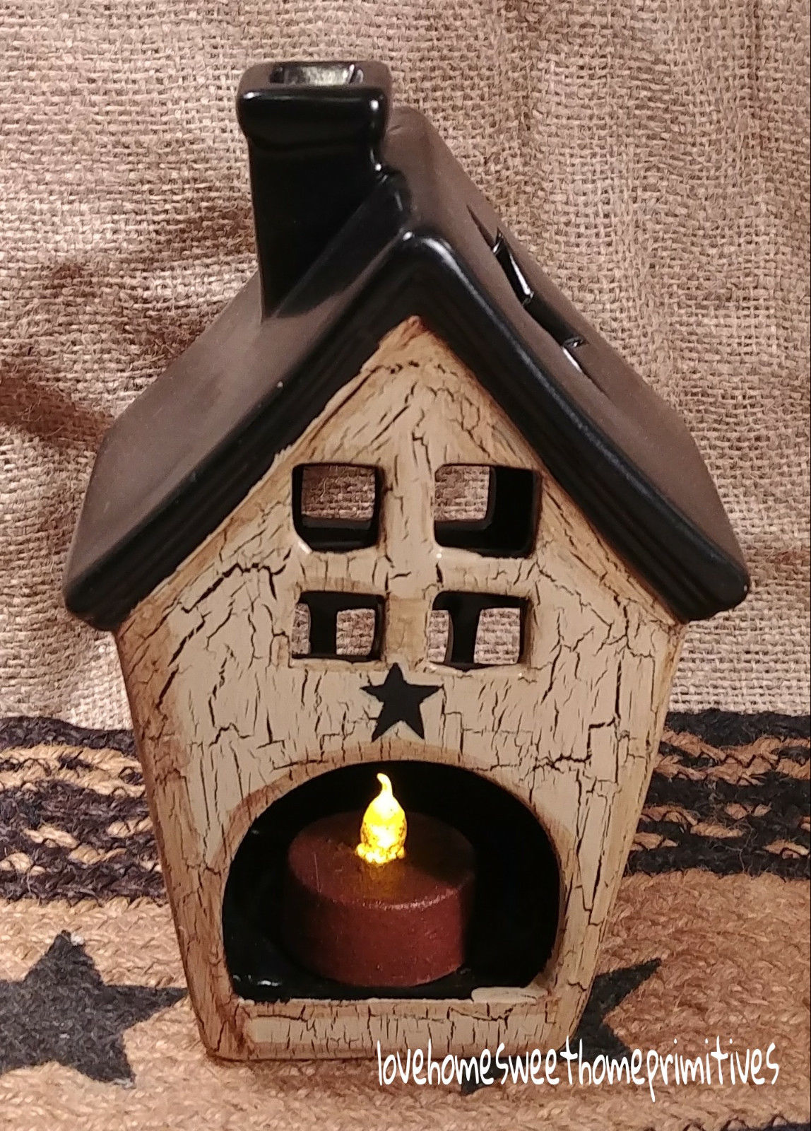 Title (ebay affiliate link): Primitive Crackle Painted Tan with Black Stars Ceramic Lighted House