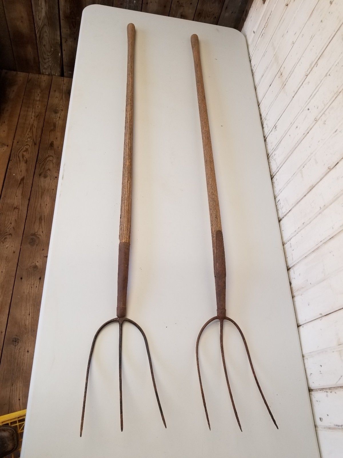Title (ebay affiliate link): 2 Old Vintage Three Tine Pitchforks ~ Rustic Primitive Antique Farm Barn Tools
