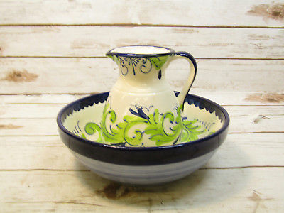 Title (ebay affiliate link): Ceramic Wash Basin Pitcher & Bowl Set Green & Blue Vines Hand crafted In Spain