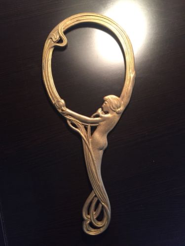 10" Antique Art Nouveau Hand Mirror Brass Glass nude Woman Handle