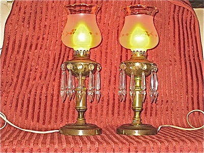 Title (ebay affiliate link): pair brass console/dresser/mantle lamps, crystal drops, etched shades
