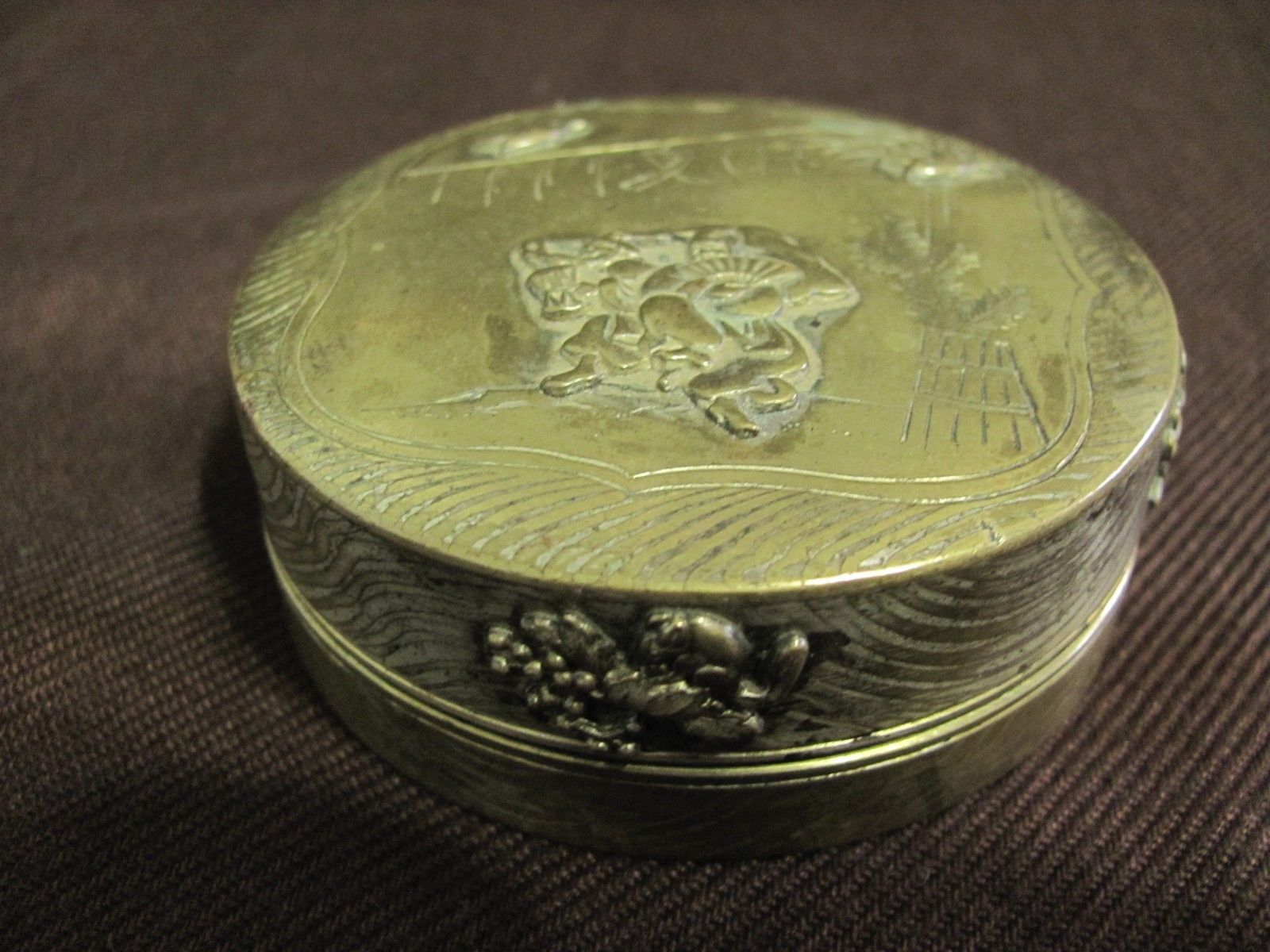 Title (ebay affiliate link): ANTIQUE CHINESE JAPANESE SNUFF BOX PILL BOX Crane Rat / Mouse Birds Dancing Men