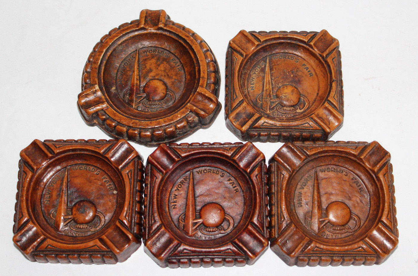 Vintage Syroco Wood Lot of 5 New York World''s Fair Ashtray 4 Square & 1 Round