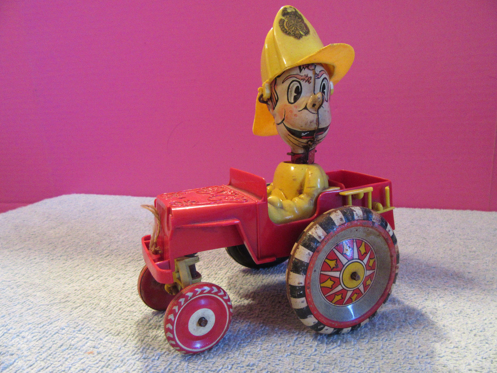 LOUIS MARX FIRE DEPT CHIEF CRAZY CAR WIND UP TOY TIN LITHO
