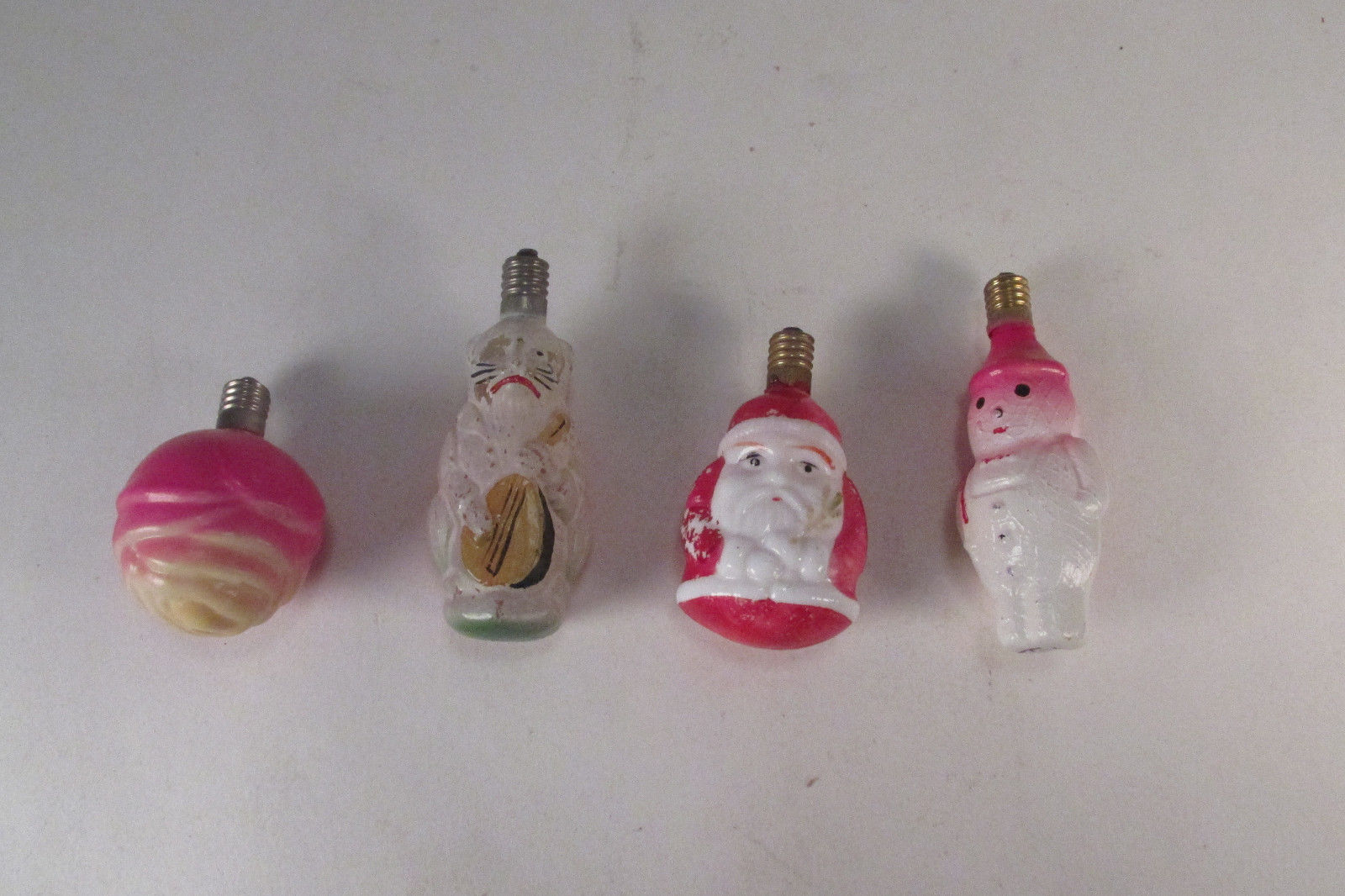 Title (ebay affiliate link): 4 Vintage Figural C-6 Christmas Light Bulbs Hand Painted Milk Glass Work Japan