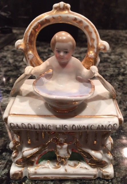 Title (ebay affiliate link): Antique Victorian Porcelain Fairing Trinket Box- "Baby paddling his own canoe"