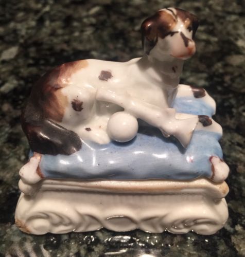 Title (ebay affiliate link): Antique Victorian Porcelain Fairing Trinket Box- Dog on dogbed with horn