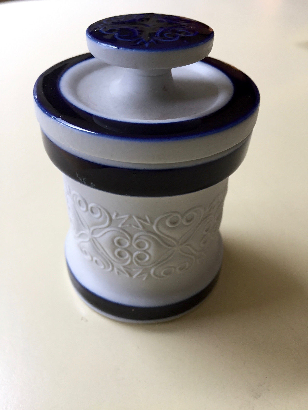 Title (ebay affiliate link): Vintage German Blue Incised Pottery Crock Storage Jar Small Canister w/ Lid SALT