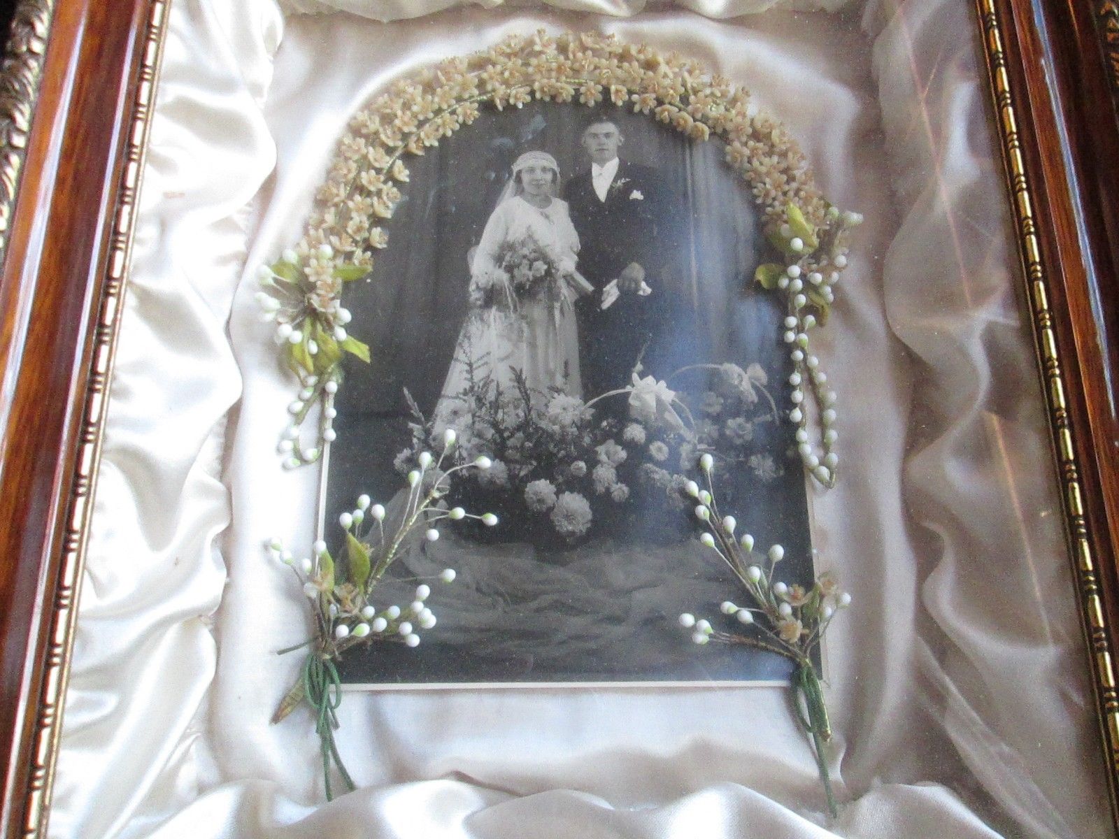 Beautiful wooden frame with wedding picture & Wax flowers-/France