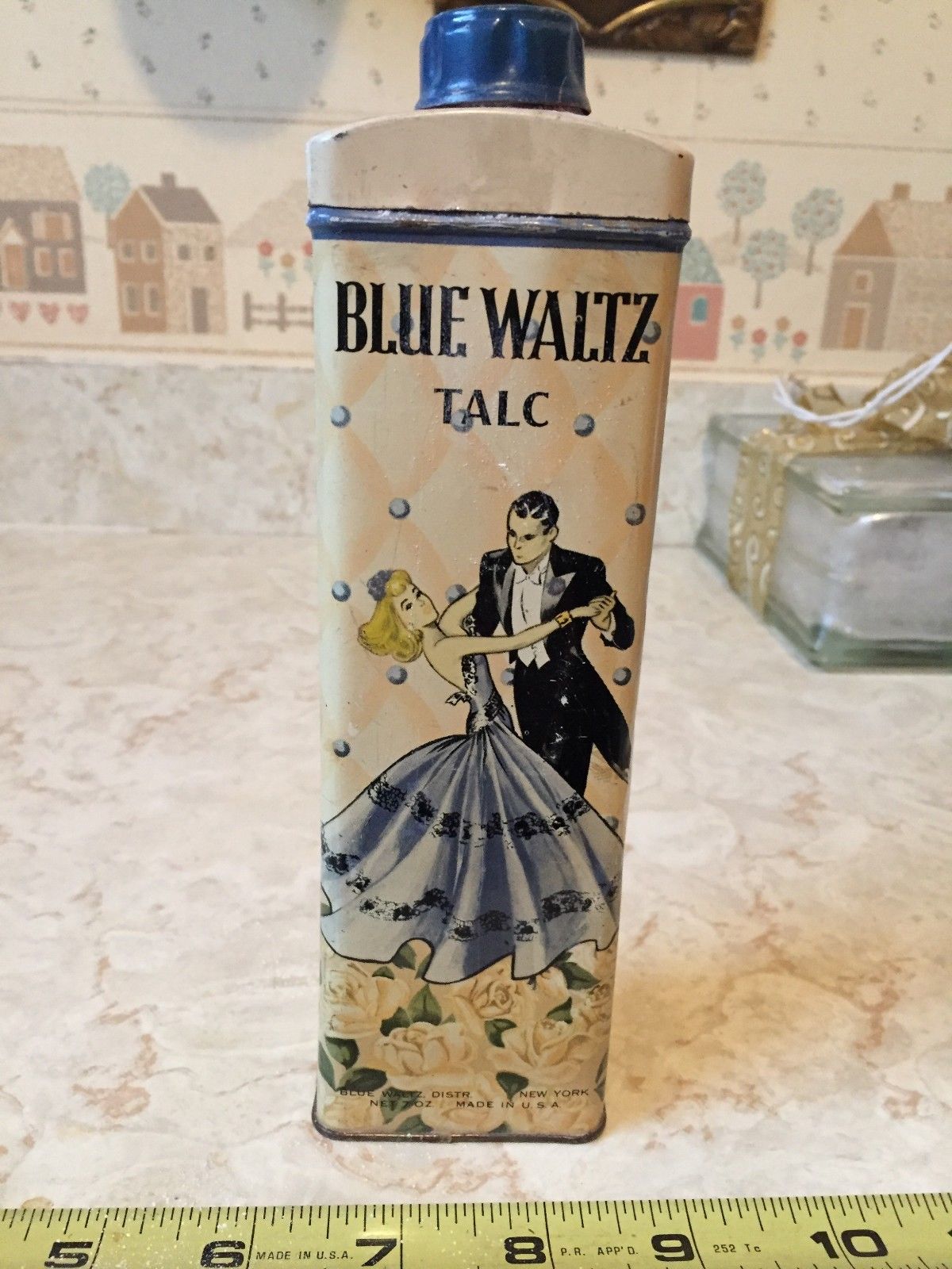 Title (ebay affiliate link): Vintage Blue Waltz Talc Powder Tin New York Yellow Roses Couple Dancing