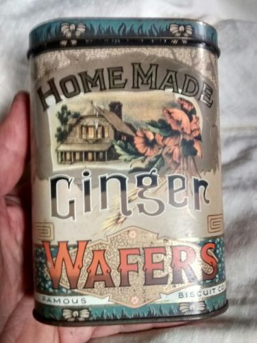 Title (ebay affiliate link): Antique Famous Biscuit Co Home Made Ginger Wafers Tin Litho Advertising Can